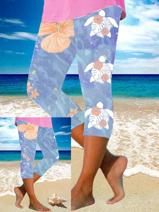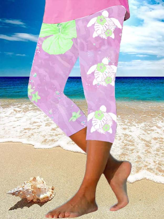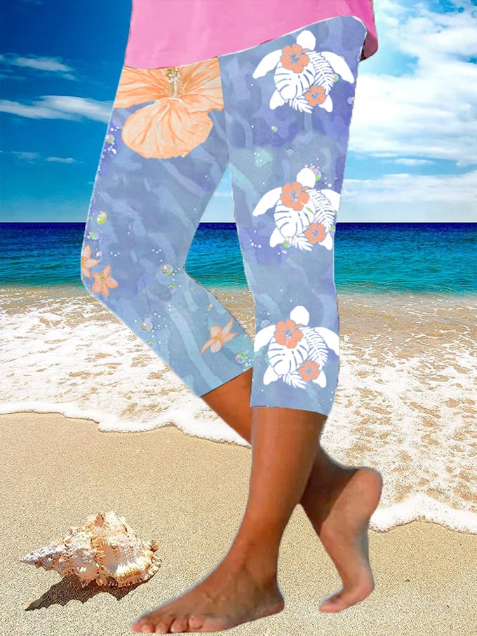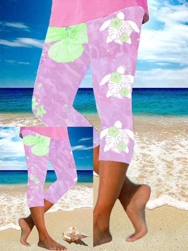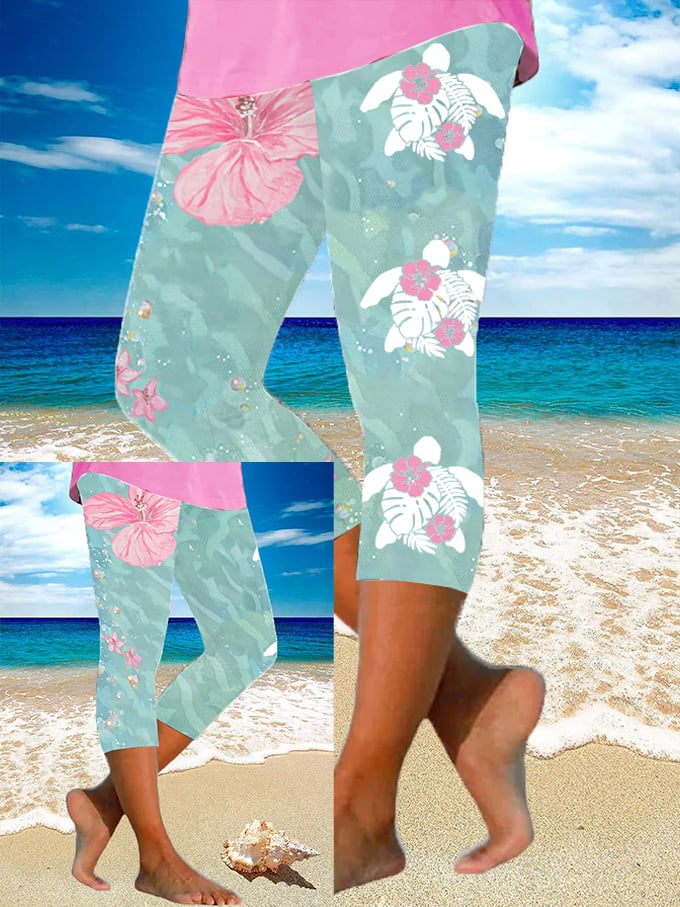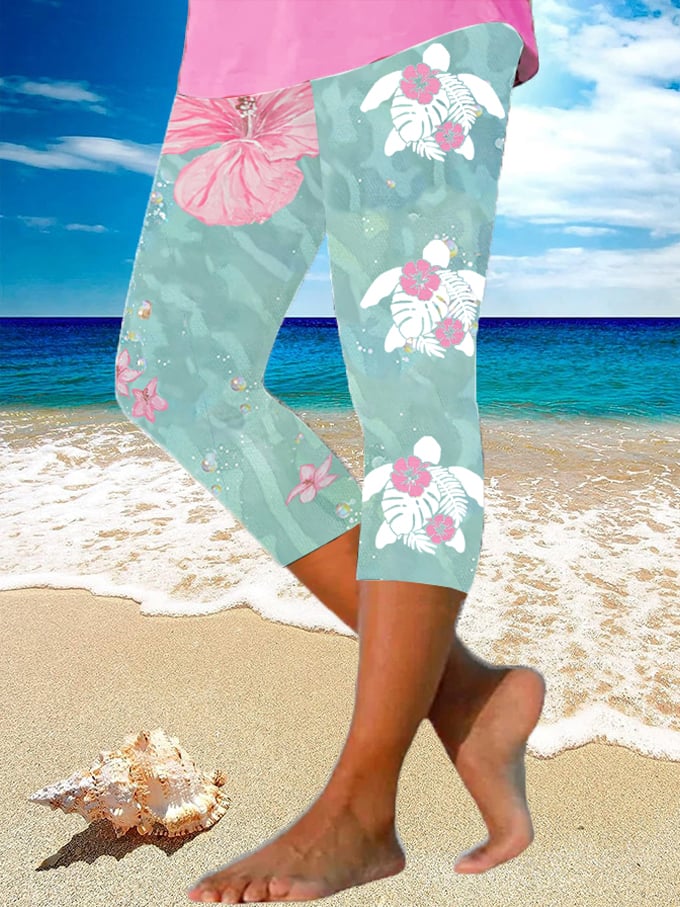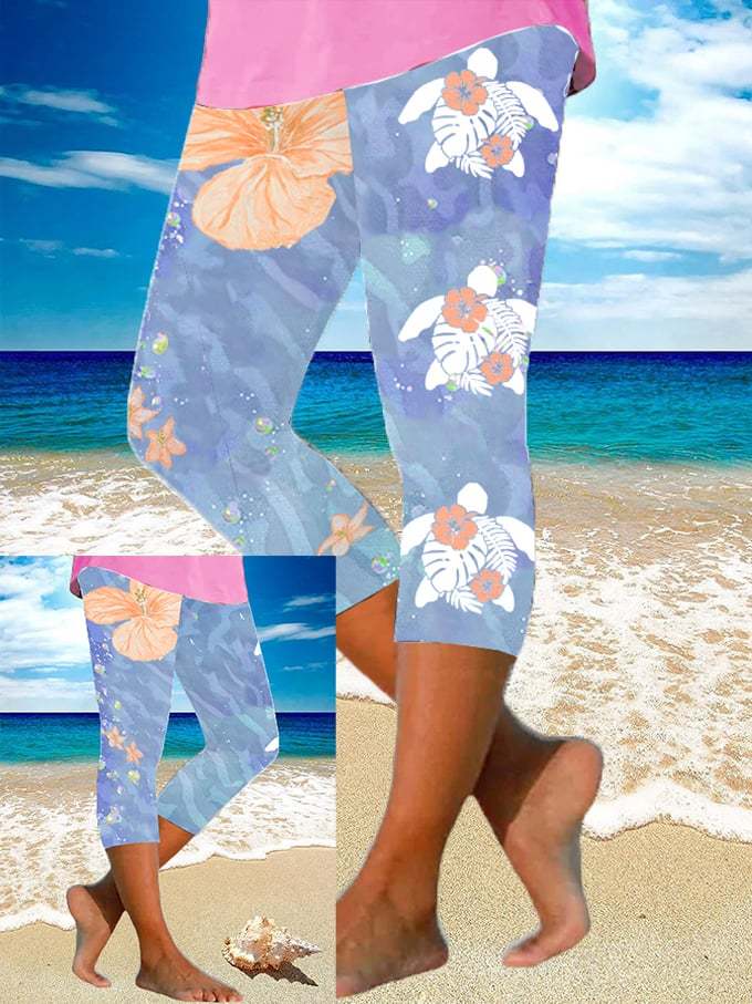 Women's Maui Lahaina Hibiscus Turtle Print Yoga Base Layer Cropped Pants